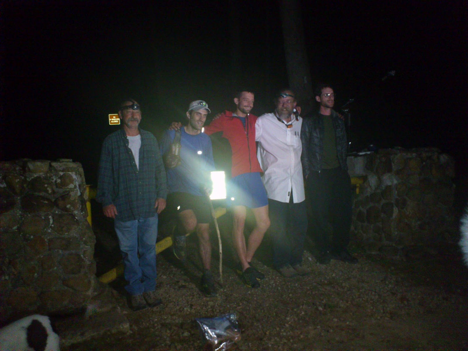 Weiter geht es auf dem Trail entlang, auf den bergauf-Parts verliere ich zumeist meine vor mir laufenden Mitstreiter, bergab kann ich dann wieder aufschließen. Irgendwann geht es hoch auf die Spitze des Bald Knob. Irgendwo auf dem Weg hinunter bin ich dann allein, komme an eine Kreuzung und laufe automatisch nach links. Vor mir sehe ich keine Stirnlampen mehr, hinter mir auch nicht. Plötzlich kommen mir Zweifel, ich werde langsamer, bleibe stehen, schaue auf meine Directions. Dort steht nichts von einer Kreuzung, auf die Idee auf die Karte zu schauen komme ich gar nicht. Ich schaue mich um, immernoch niemand zu sehen, in beiden Richtungen. Also drehe ich um und laufe ein Stück zurück, plötzlich sehe ich Stirnlampen auf mich zukommen, puh, ich bin noch richtig. Aufgrund dieser Erfahrung lasse ich mich von der Gruppe einholen und bleibe bei ihnen. Wir sind etwa mit 7-8 Mann unterwegs, eine ziemlich große Gruppe und es geht weiter über Son of a Bitch Ditch, hoch zu Garden Spot und wir finden schließlich Buch 2. Ich bin begeistert all die Namen der Orte, die ich zuvor gelesen und mir vorgestellt habe, nun wirklich live zu erleben. Ich versuche die ganze Zeit, mir den Weg irgendwie zu merken, was bis hier hin noch relativ gut gelingt, doch das ist auch der einfache Part. Ab hier geht es bald ohne Trail weiter hoch auf Stallion Mountain und wieder hinunter. Vorher erreichen wir die erste Wasserstation, es erscheint mir relativ früh, dennoch mache ich meinen Rucksack und meine Trinkflasche besser wieder komplett voll. Ich kann im Dunkeln die Umgebung nicht gut erkennen und verstärke meine Aufmerksamkeit darauf, den anderen zu folgen. Irgendwann erreichen wir Buch 3, ich habe kaum noch die Chance nachzuvollziehen, wo wir sind und weshalb wir dort hingehen. Die anderen kennen den Weg sehr gut und wir vergeuden keine Zeit, so dass ich nie dazu komme auch nur auf meine Directions oder die Karte zu schauen. Die Kompasspeilung von Stallion Mountain herunter übernehmen zum Glück andere, die auch hier fast direkt wissen, welche Richtung sie einschlagen müssen. Ich bin langsam überfordert und weiß, dass ich hier allein nicht mehr weiterkommen würde. Bislang bleibt aber die große Gruppe intakt und ich befinde mich hier unter illustren Persönlichkeiten, wie ich merke. Teil der Gruppe sind bspw. Blake Wood (ehemaliger 100-Mile-Finisher) oder auch Joe Decker (“The World’s Fittest Man”). Ich denke mir, wenn ich hier mithalten kann und wir bis ins Ziel und ggf. darüber hinaus zusammenbleiben, hätte ich Chancen auf einen Fun Run, denn ich glaube nicht, dass sich diese Herren mit einer Runde abspeisen lassen wollen.